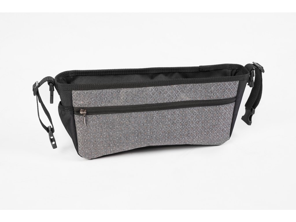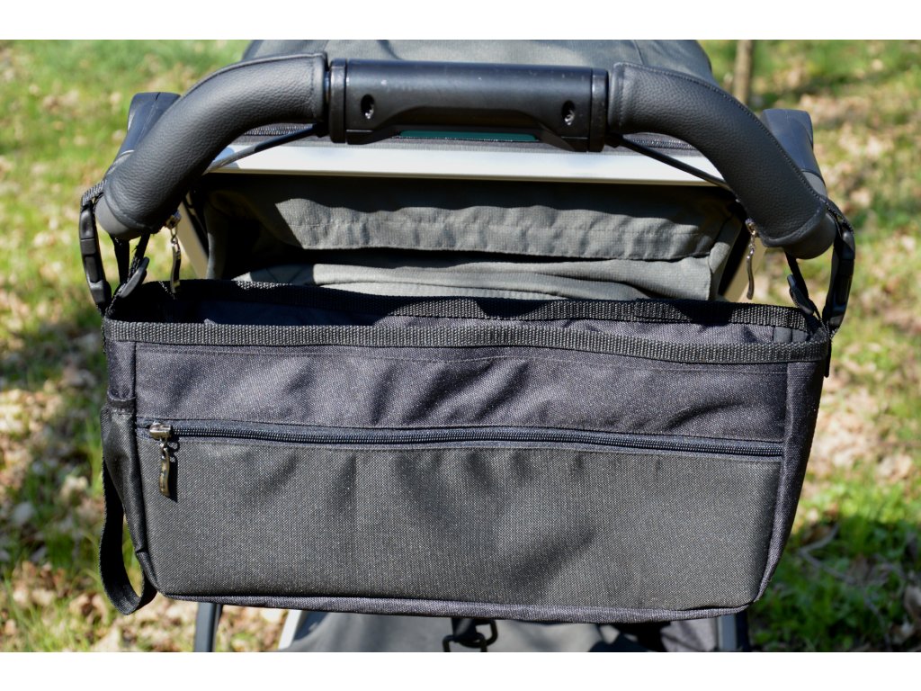 Az szervező állítható pántokkal és kapcsokkal rögzíthető a babakocsira, cipzárral zárható, tágas, oldalán praktikus zseb varrható a baba cumisüvegéhez, az szervező elülső részén hosszú cipzáras zseb található.